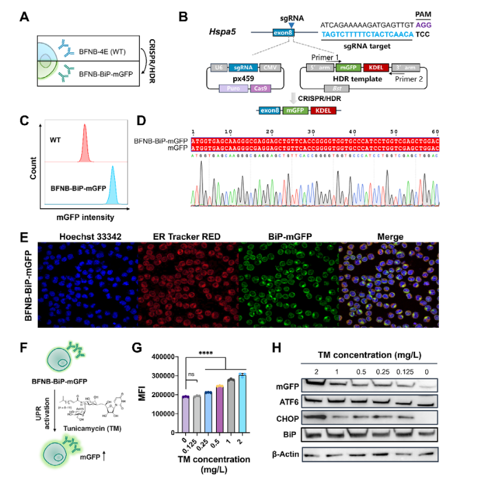 利用CRISPR/HRD同源重组技术,将mGFP荧光蛋白精准插入内质网伴侣蛋白 BiP(Hspa5) 基因的C端,构建BFNB-BiP-mGFP报告细胞系。