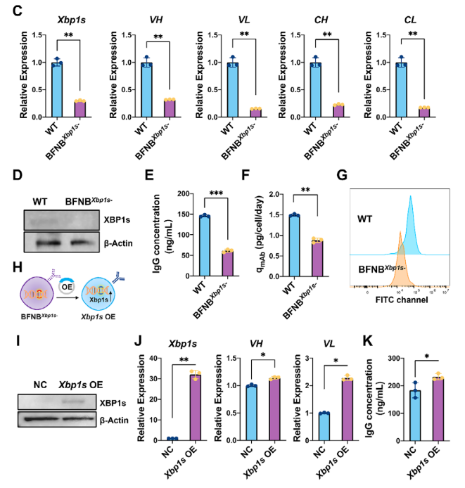 · 敲除UPR关键转录因子Xbp1s后,杂交瘤Ig表达量下降超过60%