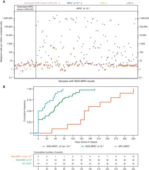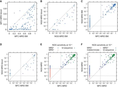 图1E和F显示出了MFC-MRD与NGS-MRD的一致性以及NGS-MRD敏感度的增加。MFC-MRD的灵敏度极限为10-4,而NGS-MRD提供了≥10-6的可靠灵敏度,临界值取决于所需的灵敏度水平和提供的细胞数量。如果使用10-6的敏感性水平,NGS检测到的样本比MFC检测到的样本多88%,如果包括任何可检测到疾病的样本(不限定敏感度截止值),NGS检测到的样本多131%。值得注意的是,没有MFC-MRD+而NGS-MRD−的样本。