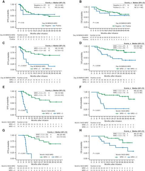在输注后3个月和6个月,BM NGS-MRD = 0患者对减少复发和更好的OS具有类似的预测能力(图3E-H)。在3个月和6个月时,在10-6cutoff下BM NGS-MRD阳性可以预测不良结果,但所有时间点的最佳预测值是使用NGS-MRD >0的cutoff。