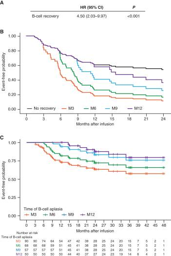 如图4所示,第一年出现b细胞恢复的患者复发风险明显高于未恢复的患者[风险比(HR)= 4.5;P < 0.001;图4A],3个月和6个月b细胞恢复的患者2年的EFS分别为9%和14%(图4B)。3至12个月持续性b细胞发育不良的患者的EFS有稳定改善(图4C)。3、6、9和12个月持续性b细胞发育不良的2年EFS值分别为63%、72%、83%和88%。有6例患者在1年后(12-37个月)出现b细胞恢复,其中5例患者持续缓解(随访18-48个月),没有进行进一步治疗,1例患者在第23个月失访。