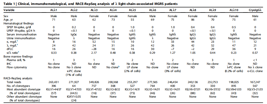 表1.lambda链相关性MGRS患者中传统检测方法和BCR测序结果的比较