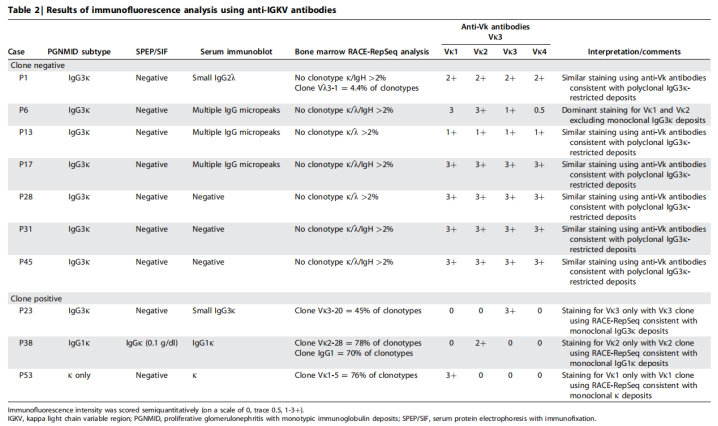 为比较clone+与clone-患者的肾小球沉积物成分差异,研究人员选取10例患者,对其肾脏样本进行了免疫荧光检测。3例clone+患者BCR测序检测到的单克隆V基因与免疫荧光检测结果相一致。而7例clone-的PGNMID-IgG3κ活检样本中,LC可变区抗体(包括Vκ1、Vκ2、Vκ3、Vκ4)均呈阳性染色。