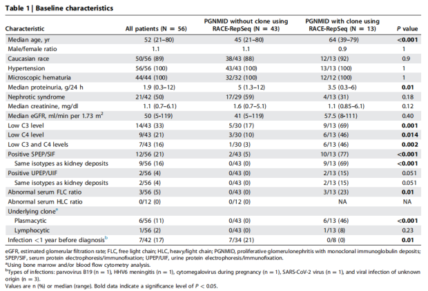 • clone+患者:年龄更大,低补体血症更常见,血清/尿液单克隆 Ig 检出率高。
