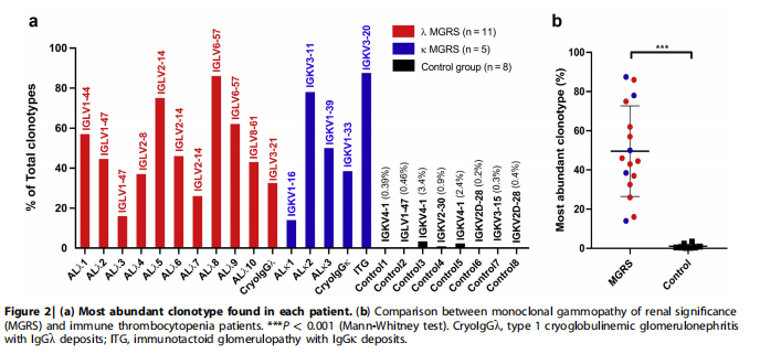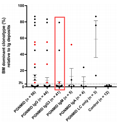 该研究纳入56例经肾活检确诊的PGNMID患者,通过5`race的BCR测序发现PGNMID具有异质性,以IgG3亚型为主的多数病例并非源于B细胞克隆性疾病,应排除在MGRS之外。