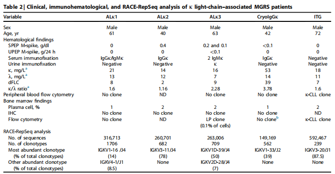表2.kappa链相关性MGRS患者中传统检测方法和BCR测序的比较