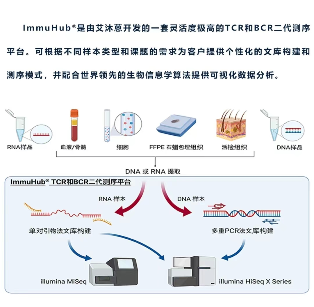 ImmuHub®技术平台是基于第二代高通量基因测序(NGS)平台利用5’RACE或多重PCR技术,使我们能直接从基因组RNA或DNA来扩增TCR/BCR的全长序列或CDR3区序列,从而进行高通量测序和数据分析。是艾沐蒽开发的一套灵活度极高的TCR/BCR二代测序平台。