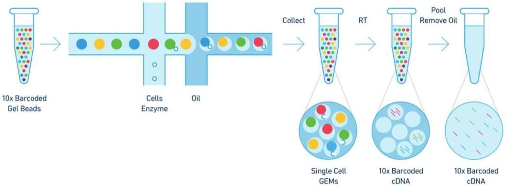 10x单细胞V(D)J测序是利用8通道的微流体“双十字”交叉系统将含Barcoded RT Primers的Gel Beads、细胞和酶的混合物、油三者结合形成GEMs,在GEMs中,凝胶珠自动溶解释放大量barcode序列,同时每个细胞裂解释放出mRNA,mRNA再逆转录产生带有10xbarcode和UMI信息的cDNA。标记后的cDNA被分成2份,一份使用针对TCR/BCR的C区巢式引物扩增,从而富集T细胞或B细胞,获得TCR/BCR全长VDJ序列,另一份直接构建基因表达的文库,获取5’端基因表达的数据。最后使用Illumina测序平台对文库进行测序检测,即可一次性获得大量单细胞的基因表达和免疫组库数据,从而实现在单细胞水平进行免疫组库测序的目的。