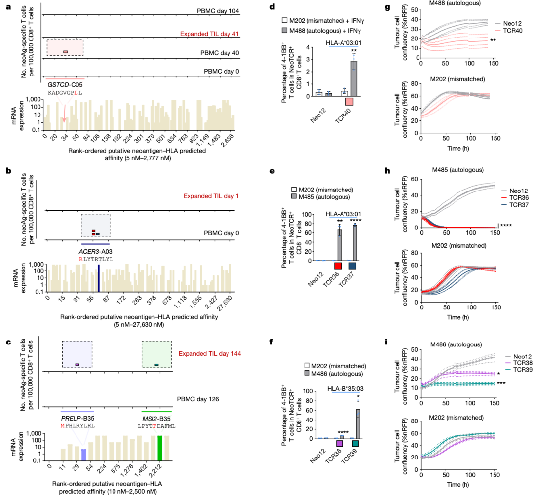 研究结果表明,肿瘤的新抗原特异性免疫反应针对黑素瘤中有限数量的免疫显性突变(范围3到13),与肿瘤突变负荷和免疫治疗的临床反应无关。无论如何,在对抗PD-1有长期临床反应的患者中,新抗原特异性T细胞反应是多克隆的,随着时间的推移,多个新抗原特异性TCR克隆型(范围1到23)反复针对相同的突变,并在血液和肿瘤中检测到。这些结果表明,自然T细胞反应通过靶向数量非常有限的不同T细胞克隆型突变来清除肿瘤,其中一些细胞识别不同的HLA-新表位复合物,呈现相同的非同义突变。无论如何,研究者不能排除T细胞靶向非突变的肿瘤相关抗原(如黑素体分化抗原)在整体抗肿瘤反应中的作用。