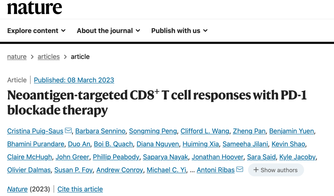 Puig-Saus C, Sennino B, Peng S, Wang CL, Pan Z, Yuen B, Purandare B, An D, Quach BB, Nguyen D, Xia H, Jilani S, Shao K, McHugh C, Greer J, Peabody P, Nayak S, Hoover J, Said S, Jacoby K, Dalmas O, Foy SP, Conroy A, Yi MC, Shieh C, Lu W, Heeringa K, Ma Y, Chizari S, Pilling MJ, Ting M, Tunuguntla R, Sandoval S, Moot R, Hunter T, Zhao S, Saco JD, Perez-Garcilazo I, Medina E, Vega-Crespo A, Baselga-Carretero I, Abril-Rodriguez G, Cherry G, Wong DJ, Hundal J, Chmielowski B, Speiser DE, Bethune MT, Bao XR, Gros A, Griffith OL, Griffith M, Heath JR, Franzusoff A, Mandl SJ, Ribas A. Neoantigen-targeted CD8+ T cell responses with PD-1 blockade therapy. Nature. 2023 Mar 8. doi: 10.1038/s41586-023-05787-1. Epub ahead of print. PMID: 36890230.