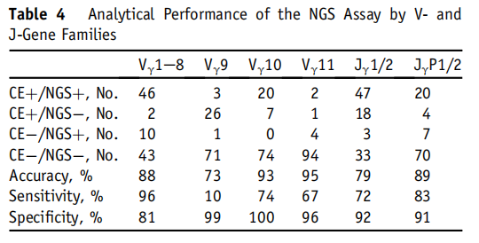 59%的不一致样本涉及Vγ9的克隆CE峰,而NGS不视为主要的克隆型。有4例Vγ9重排不一致的病例通过单管TRG CE方法进一步证实为阴性。NGS检测通过其单管设计有效地解决了这一限制,在这种设计中,在包含所有可能重排的更稳健的多克隆背景下,不太可能出现虚假重排。事实上,根据我们的临床病理相关性,没有一个NGS结果被归因为假阳性。在排除潜在的CE假阳性结果后,NGS检测的总体准确率为89%,敏感性为79%,特异性为100%。