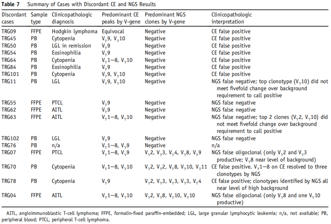 在25个不一致的样本中,13个被CE解释为克隆,但被NGS称为多克隆。其中7例未显示任何血液淋巴样恶性肿瘤的临床病理证据,提示CE结果可能是假阳性。有临床病理证据支持的5个克隆样本中存在克隆t细胞恶性肿瘤,提示这些NGS结果可能是假阴性。最后一个CE阳性NGS阴性的样本没有临床病理学证据可供审查。