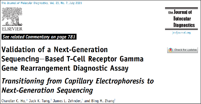 Chandler C Ho , Jack K Tung , James L Zehnder ,Bing M Zhang. Validation of a Next-Generation Sequencing-Based T-Cell Receptor Gamma Gene Rearrangement Diagnostic Assay: Transitioning from Capillary Electrophoresis to Next-Generation Sequencing. J Mol Diagn. 2021 Jul;23(7):805-815.