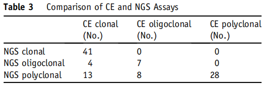 4个样本被CE称为克隆,但被NGS称为寡克隆。其中2例无血液淋巴样恶性肿瘤的临床病理证据,提示CE结果可能是假阳性。另两个样本显示CE鉴定的两个主峰和NGS鉴定的多种显著性克隆型,可能代表双克隆过程。这突出了CE检测的一个重要局限性,即在CE上显示相同大小的不同克隆重排不容易被区分。而NGS可以通过其独特的序列来区分这些克隆型。