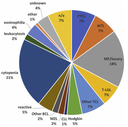 注:本研究中纳入的患者的临床病理诊断。AITL血管免疫母细胞T细胞淋巴瘤,BCL b细胞淋巴瘤,CLL慢性淋巴细胞白血病,MF真菌病,MZL边缘区淋巴瘤,PTCL外周T细胞淋巴瘤,TCL T细胞淋巴瘤,T-LGL T细胞大颗粒淋巴细胞白血病。