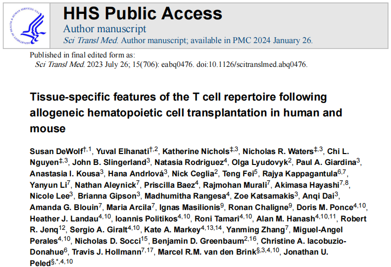 在30-50%的同种异体造血细胞移植(allo-HCT)受者中,异种反应性T细胞识别受体抗原触发急性移植物抗宿主病(GVHD),主要攻击皮肤、胃肠道和肝脏。发生免疫激活的局部环境对GVHD的发病机制很重要,但由于从患者身上取样的难度限制,目前对GVHD T细胞生物学(特别是受累T细胞受体(TCR)库)的理解大都是来自动物模型、患者外周血的循环 T 细胞以及诊断性皮肤和胃肠道活检中收集的样本,仍缺乏关于在GVHD过程中持续存在于组织中的T细胞的数据。 发表于Science Translational Medicine上的一篇文章对此进行了研究,通过TCR测序揭示了小鼠和人类移植后T细胞库的组织特异性特征,从而提供了对GVHD病理机制的新见解。