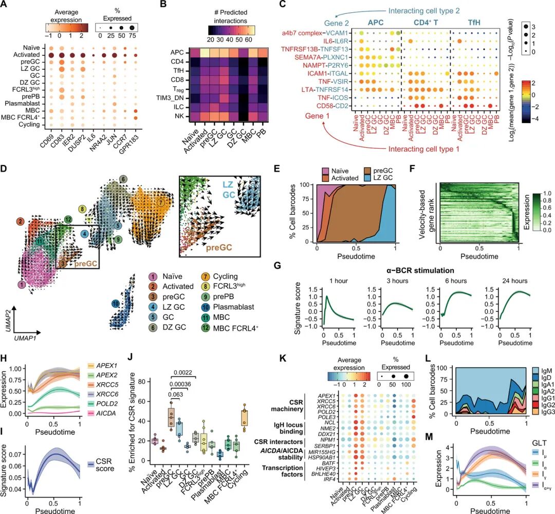 作者对人体内B细胞激活的重建显示,在pre-GC B细胞中,与CSR相关的基因意外富集(图3H至J),与常规CSR位点的LZ GC B细胞相比,其富集程度相似或更高。虽然AICDA的表达水平很低(图2H),但作者对pre-GC和LZ GC过渡的分析显示,其他基因与CSR有机制联系,包括那些能够结合IgH位点内的开关区序列、与CSR机制相互作用或调节AICDA/AICDA稳定性的基因(图3K)。虽然作者观察到很少有切换的pre-GC B细胞(图2)。基于对高置信度scVDJ序列的分析,作者发现pre-GC细胞中IgH种系转录本(GLTs)的表达在IgH位点达到峰值(图M)。