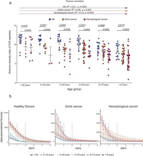 图3.健康个体和癌症患者年龄相关TCR库多样性