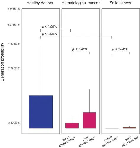 作者观察到未经治疗的癌症患者的T细胞产生概率比健康受试者低,这表明癌症患者的克隆扩增更多。此外,与我们的假设一致,我们观察到明显的转变(hemC:p=1.3E−15,solC:p < 2.2E−16),在癌症患者队列中,在治疗间隔内,中位生成概率增加(图8)。这一数据表明,血毒化疗可以消除周围的T细胞克隆,然后通过胸腺产生反弹来重建细胞库。