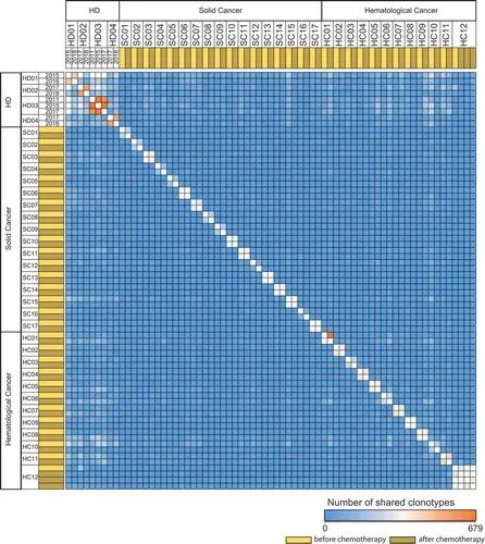 图7.T细胞库在健康个体和癌症患者化疗前后重叠。