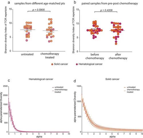 图5.化疗对肿瘤患者T细胞多样性的影响。