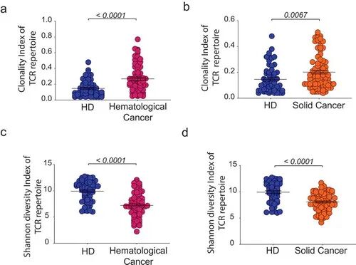图2.健康个体和癌症患者年龄相关TCR库克隆