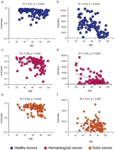 与先前发表的数据一致,10名健康供者的T细胞库随着年龄的增加而明显收缩,多样性下降,大约在40岁以后开始(相关系数R2=0.27, p<0,图3a,b)。对于实体肿瘤患者或血液癌患者,观察到T细胞库多样性与年龄有相同下降,但斜率更陡(实体癌相关系数R2=0.08, p=0.003,血液癌相关系数R2=0.13, p<0.01,图3a,b)。