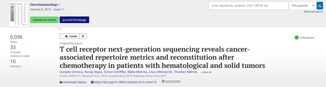 T cell receptor next-generation sequencing reveals cancer-associated repertoire metrics and reconstitution after chemotherapy in patients with hematological and solid tumors,OncoImmunology, 8:11, e1644110, DOI:10.1080/2162402X.2019.1644110