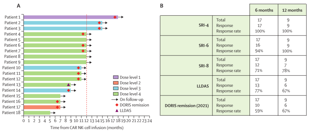 临床试验纳入18名经至少两种标准疗法治疗失败的难治性SLE患者,接受氟达拉滨联合环磷酰胺预处理后,分三次输注CAR-NK细胞。结果令人惊喜: