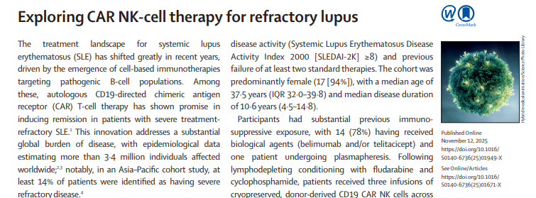 参考文献:Gao J, Li MT, Sun M, et al. Efficacy and safety of allogeneic CD19 CAR NK-cell therapy in systemic lupus erythematosus: a case series in China, The Lancet, 2025, Volume 0, Issue 0 DOI: 10.1016/S0140-6736(25)01671-X