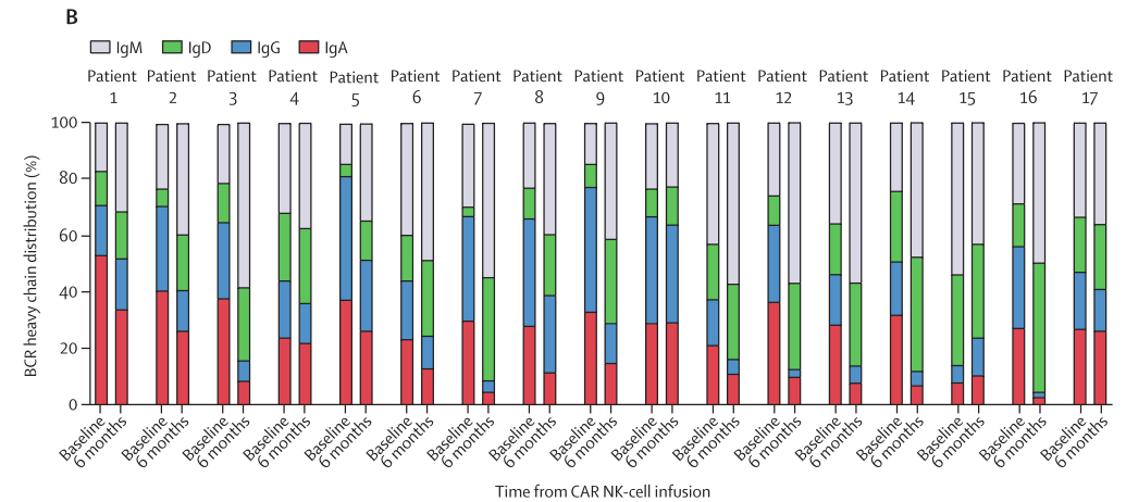 治疗后患者B细胞受体库从IgG/IgA主导型,转变为IgD/IgM主导型,标志着抗原经验型记忆B细胞被清除,naive B细胞重新成为优势群体。(fig 3)