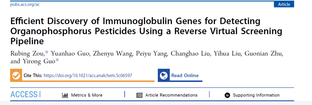 参考文献:Zou Rubing, Guo Yuanhao, Wang Zhenyu, et al., Efficient Discovery of Immunoglobulin Genes for Detecting Organophosphorus Pesticides Using a Reverse Virtual Screening Pipeline, Anal. Chem. 2026, 0003-2700.