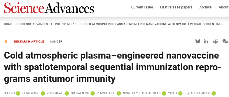Li S, Wang P, Wu Z, et al. Cold atmospheric plasma-engineered nanovaccine with spatiotemporal sequential immunization reprograms antitumor immunity. Sci Adv. 2026;12(13):eaeb5894.