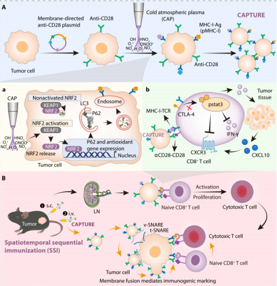 该研究利用低温大气等离子体工程化改造肿瘤细胞纳米囊泡,构建CAPTURE疫苗,通过p62自噬增强全谱抗原呈递+αCD28直接激活T细胞+时空序贯靶向递送,彻底重编程抗肿瘤免疫,在小鼠模型实现近乎完全的肿瘤抑制,为克服肿瘤免疫逃逸、开发个性化广谱肿瘤疫苗提供了全新技术与理论。