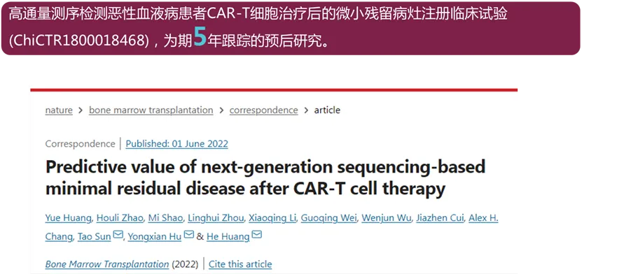 1、Huang Y, Zhao H, Shao M, Zhou L, Li X, Wei G, Wu W, Cui J, Chang AH, Sun T, Hu Y, Huang H. Predictive value of next-generation sequencing-based minimal residual disease after CAR-T cell therapy. Bone Marrow Transplant. 2022 Jun 1. doi: 10.1038/s41409-022-01699-2. Epub ahead of print. PMID: 35650329.(点击链接可查看文章内容)