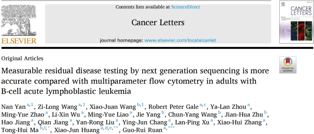 4、Yan N, Wang ZL, Wang XJ, et,al. Measurable residual disease testing by next generation sequencing is more accurate compared with multiparameter flow cytometry in adults with B-cell acute lymphoblastic leukemia. Cancer Lett. 2024 Jul 4;598:217104. doi: 10.1016/j.canlet.2024.217104.