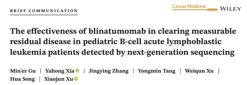 3、Min’er Gu,Yahong Xia, Jingying Zhang, Yongmin Tang, Weiqun Xu, Hua Song  Xiaojun Xu. The effectiveness of blinatumomab in clearing measurable residual disease in pediatric B-cell acute lymphoblastic leukemia patients detected by next-generation sequencing.  Cancer Med. 2023 Dec;12(24):21978-21984. doi:10.1002/cam4.6771. (点击链接可查看文章内容)