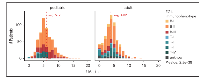 fig 2. 儿童与成人ALL患者每例克隆性IG/TR重排标志物数量对比