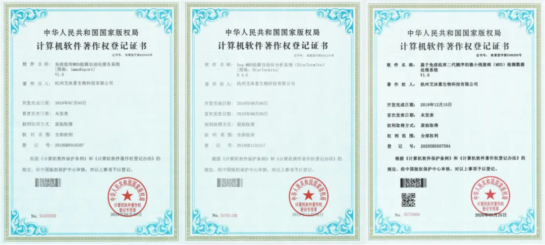 [1]“免疫组库MRD检测自动化报告系统[简称ImmuReport] V1.0”(登记号:2019SR0916207)