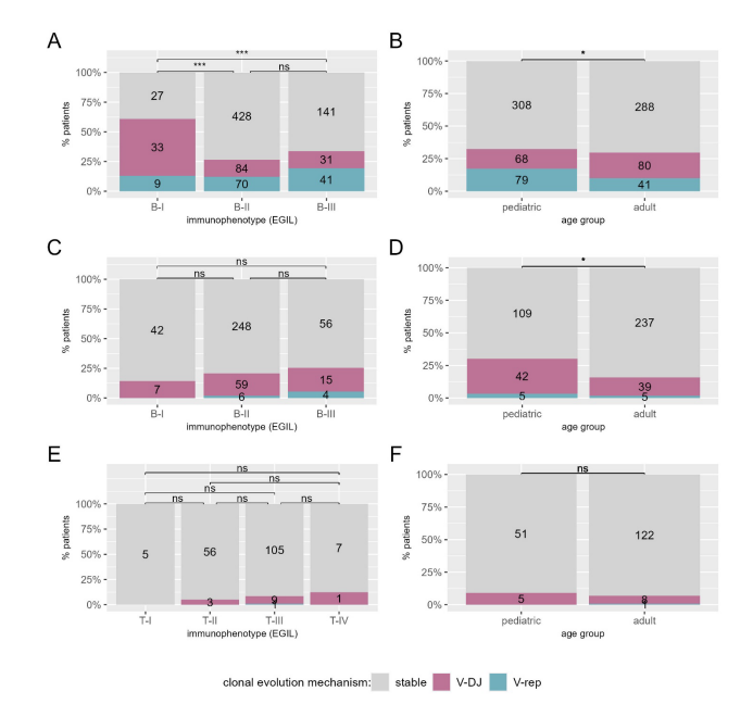 正常B细胞和成熟B细胞恶性肿瘤中,跨系TR重排极为罕见,但在B-ALL中因V(D)J重组酶系统的持续异常激活而普遍存在,且这一特征同样呈现明显的年龄差异:93.3% 的儿童B-ALL患者存在跨系TR重排,而成人为78.9%(P=2.3e-10)。