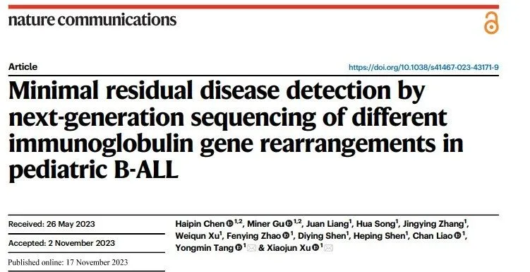 2、Chen H, Gu M, Liang J, Song H, Zhang J, Xu W, Zhao F, Shen D, Shen H, Liao C, Tang Y, Xu X. Minimal residual disease detection by next-generation sequencing of different immunoglobulin gene rearrangements in pediatric B-ALL. Nat Commun. 2023 Nov 17;14(1):7468. doi: 10.1038/s41467-023-43171-9. (点击链接可查看文章内容)