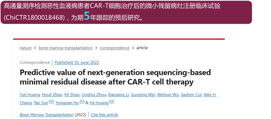 1、Huang Y, Zhao H, Shao M, Zhou L, Li X, Wei G, Wu W, Cui J, Chang AH, Sun T, Hu Y, Huang H. Predictive value of next-generation sequencing-based minimal residual disease after CAR-T cell therapy. Bone Marrow Transplant. 2022 Jun 1. doi: 10.1038/s41409-022-01699-2. Epub ahead of print. PMID: 35650329.(点击链接可查看文章内容)