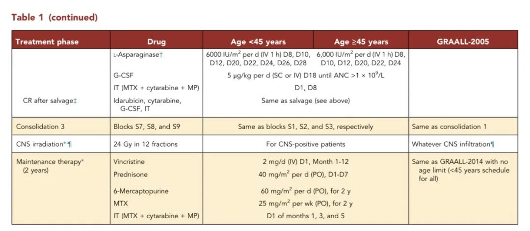 (2)年龄适配化疗流程:以7天泼尼松预治疗启动,后续行五药诱导;诱导失败给予挽救治疗,毒性不耐受者最多接受2个备用疗程;巩固阶段使用大剂量甲氨蝶呤与阿糖胞苷。