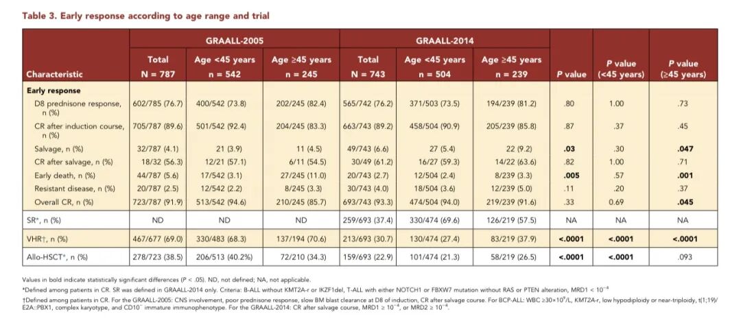 2.诱导与挽救治疗应答:在GRAALL 2014研究中,76.2%患者第8天泼尼松应答良好,与既往研究一致。诱导治疗结束后,89.2%患者达到完全缓解(CR),年轻患者缓解率更高。与GRAALL 2005相比,≥45岁患者早期死亡率显著下降至3.3%,挽救期无死亡,因此该人群接受挽救治疗的比例更高。经挽救治疗后超六成患者获CR,整体经1~2疗程治疗后总CR率达93.3%,其中≥45岁患者缓解率显著提升,主要得益于早期死亡减少及挽救治疗应用增加。