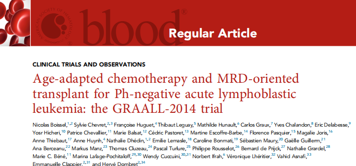 文献来源:Boissel N, Chevret S, Huguet F, Leguay T, Hunault M, Graux C, Chalandon Y, Delabesse E, Hicheri Y, Chevallier P, Balsat M, Pastoret C, Escoffre-Barbe M, Pasquier F, Joris M, Thiebaut A, Huynh A, Dhédin N, Lemasle E, Bonmati C, Maury S, Guillerm G, Berceanu A, Manz M, Cluzeau T, Turlure P, Rousselot P, de Prijck B, Grardel N, Béné MC, Lafage-Pochitaloff M, Cuccuini W, Ifrah N, Lhéritier V, Asnafi V, Clappier E, Dombret H. Age-adapted chemotherapy and MRD-oriented transplant for Ph-negative acute lymphoblastic leukemia: the GRAALL-2014 trial. Blood. 2026 Feb 19;147(8):821-833. doi: 10.1182/blood.2025029611. PMID: 41135009.