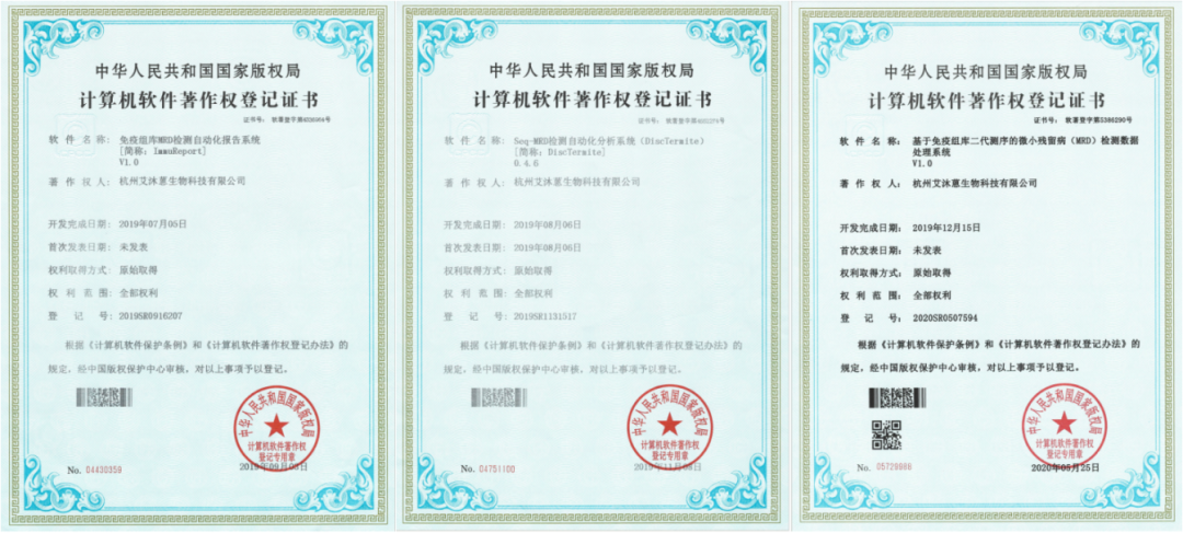 艾沐蒽拥有自主研发的生信分析平台,艾沐蒽Seq-MRD® 已经获得3项国家计算机软件著作: